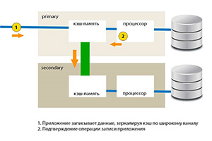По запросу хоста на запись порция данных сперва записывается в кэш-память первичного контроллера, потом копируется в кэш-память второго контроллера, тот подтверждает факт записи в его кэш-память, и только после этого первичный контроллер отчитывается перед хостом о завершении записи. Многоходовое подтверждение записи, естественно, вносит задержки.