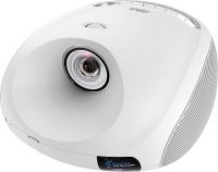 Конструктивно проектор исполнен в округлом корпусе из твердой пластмассы. На боковых панелях за декоративными решетками размещены динамики и заборные отверстия системы охлаждения. Сверху расположены кнопки управления (ближе к тыльной стороне) и фокусировочное кольцо. Качество картинки даже превзошло наши ожидания: хорошее попадание в цвет, высокая контрастность и насыщенность цветов. Однако, как и у всех DLP-проекторов с одним DMD-чипом, заметна асинхронность цветовых каналов: фронты подвижных объектов расслаиваются. На монохромных градиентных растяжках наблюдается ступенчатость. Оптическая трансфокация не предусмотрена вовсе (изменить размер проекции можно либо перемещая проектор относительно экрана, либо используя цифровой зум), зато имеется возможность оптической коррекции трапециевидных искажений. Перемещение группы линз осуществляется моторизированным приводом. Коммутационный блок расположен на передней панели под объективом – несколько нетрадиционно, но вполне удобно. Присутствуют как аналоговые видеовходы, так и цифровой HDMI. На тыльной стороне находится USB-хост для подключения флэш-накопителя (воспроизводятся только изображения в формате JPEG).
