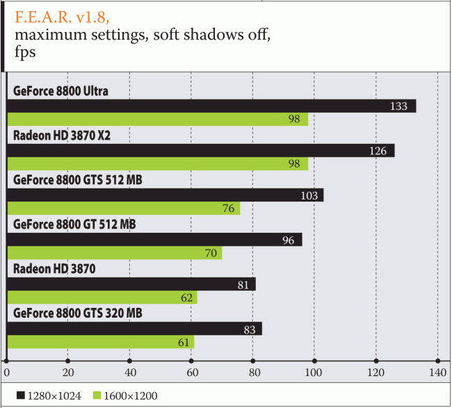 В остальном же Radeon HD 3870 X2 показывает неплохие результаты. Например, в F.E.A.R. и обоих 3DMark плата идет на уровне GeForce 8800 Ultra, где-то отставая, а где-то даже опережая флагманский ускоритель NVIDIA. О Crysis мы уже сказали – в этой игре Radeon HD 3870 X2 лишь немного быстрее одиночной Radeon HD 3870 и по производительности может быть приравнен к GeForce 8800 GT 512 MB.