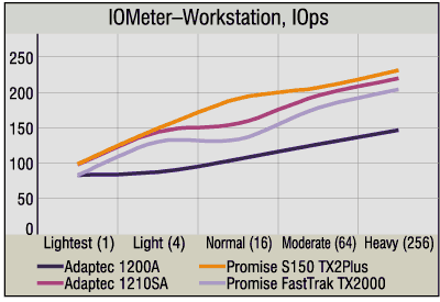Promise FastTrak TX2000 везде оказывается существенно быстрее Adaptec 1200A. Чипсет, использованный в последнем, вряд ли является оптимальным даже для RAID-контроллера начального уровня.