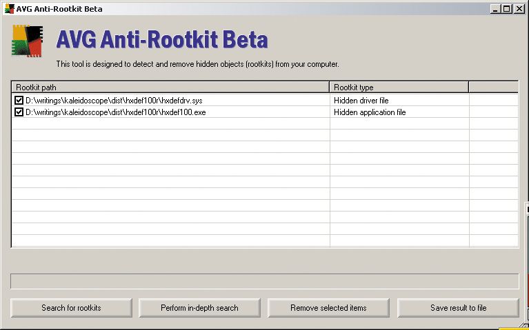 Неплохое впечатление производит вышедшая буквально на днях первая бета-версия AVG Anti-Rootkit от компании GRISOFT – для ее получения необходима регистрация. Программа имеет предельно простой интерфейс и предназначена для нахождения и удаления скрытых объектов файловой системы, заявлена также возможность обнаружения rootkit, использующих NTFS ADS. Документация, увы, пока напрочь отсутствует.