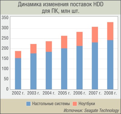 Но начнем все же с компьютерной отрасли, к которой пока еще наиболее тесно привязаны производители накопителей на жестких дисках. Здесь, как известно, последние пару лет, после общего спада в индустрии IT, наблюдается заметный подъем. Соответственно, и поставки HDD растут весьма существенными темпами.