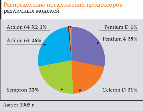 Жесткая борьба на рынке между грандами процессорной индустрии привела к тому, что количество их позиций уравнялось практически во всех секторах – как недорогих решений, так и самых передовых разработок. Конечно, разницу в 2–3% процента для процессоров, предназначенных для построения систем низкой ценовой категории (Celeron D и Sempron), трудно назвать критичной. Но для высокопроизводительных решений (Athlon 64 и Pentium 4) такой разрыв еще меньше – он равен лишь 1,2–1,9%. Здесь стоит особо отметить, что количество предложений Pentium 4 для Socket 478 сократилось почти в пять раз, поэтому конкуренцию продуктам от AMD составляют в основном процессоры, рассчитанные на Socket 775.