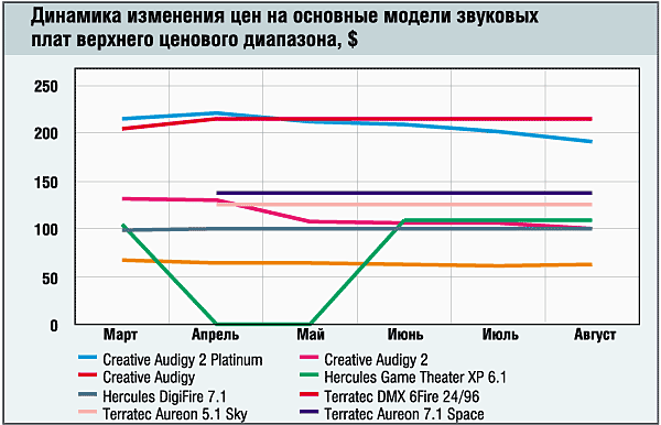 В нише недорогих звуковых карт -- без особых перемен. Количество предложений Creative SB Live! продолжает сокращаться, с 25 в марте до 15 в июле, что, вероятно, объясняется постепенным снижением интереса со стороны покупателей к недорогим платам в пользу встроенных решений либо hi-end-продуктов.