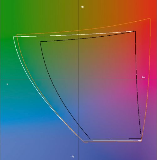 Контур цветового охвата в плоскости L=50 координатного цветового пространства Lab – действительно очень широкий. Особенно сильно выделяется область красного (a+/b+), в то же время в зеленой (a-/b+) монитор несколько «не дотянул» до контура AdobeRGB. В более ярких частях L>60 контур дисплея полностью охватывает и sRGB, и AdobeRGB; в теневых же L<40 несколько «срезан» сине-фиолетовый угол (a+/b-).