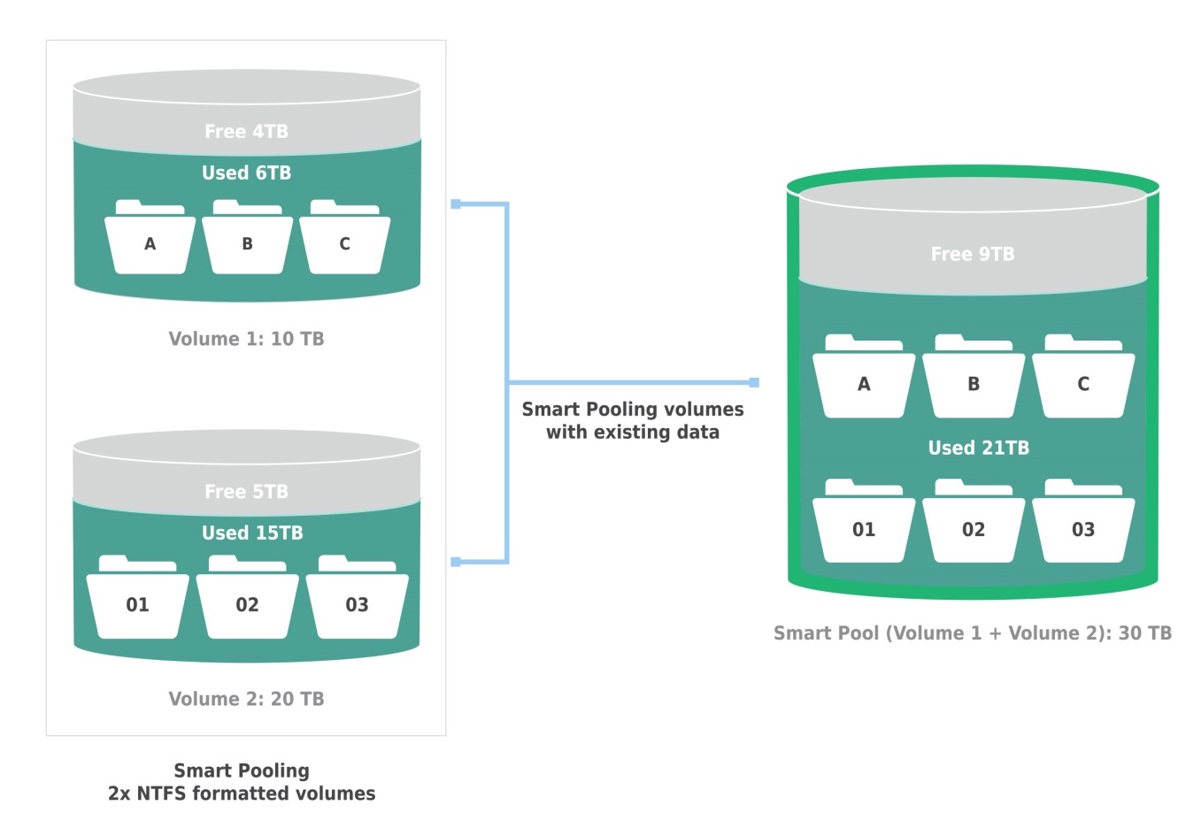 Тiger Technology Smart Pooling решает эту проблему простым и элегантным способом. В отличие от виртуализации на уровне блоков (как это делают аппаратные RAID контроллеры), Smart Pooling создает виртуальную файловую систему (storage pool) поверх существующей файловой системы (NTFS). Такой подход имеет два преимущества – гетерогенность объединяемых ресурсов (Fibre Channel, SAS, iSCSI, FireWire, USB) и возможность собирать/разбирать пул на ресурсах с данными без их потери.