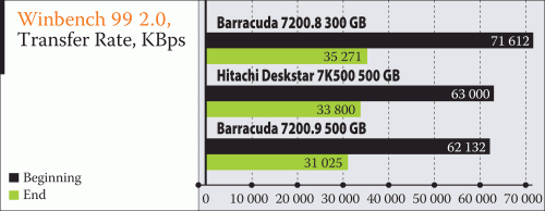 К сожалению, первые результаты не слишком утешительны – по итогам Winbench 99 новая модель уступает по скорости предыдущей. Причем это касается даже линейного чтения. Однако отметим, что Barracuda 7200.9 объемом 160 GB показывает лучший результат. К примеру, ее пиковое значение превышает отметку 70 MBps. В данном случае потеря скорости объясняется как сниженной плотностью записи, так и увеличенным количеством пластин и уменьшенным временем доступа. Но, как мы уже говорили, все это является платой за надежность диска.