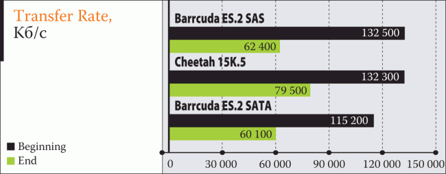Если говорить о сравнительном быстродействии, то разница между SAS- и SATA-вариантами Barracuda ES.2 небольшая. Разумеется, она есть, но ее величина примерно равна разнице в стоимости между этими накопителями. А вот отрыв «взрослого» SAS-диска Cheetah 15K.5 от ES.2 достаточно ощутим. Впрочем, цена его также соответствующая...
