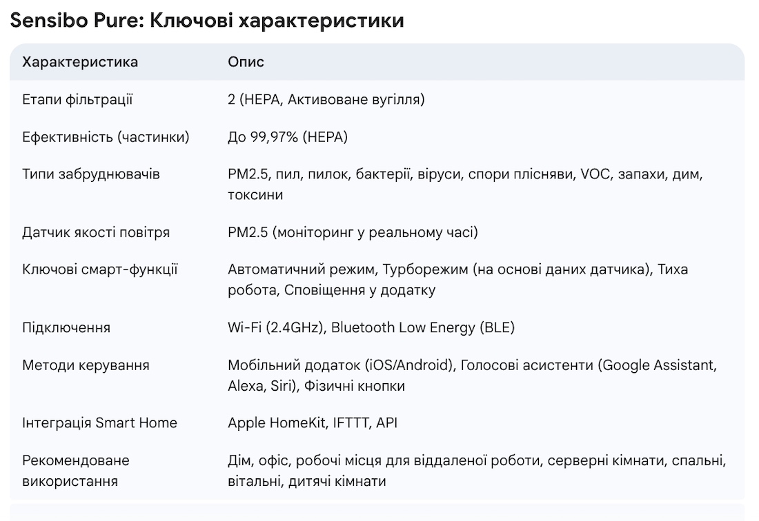 Підсумовуючи, Sensibo Pure – це значно більше, ніж просто очищувач повітря. Це інтелектуальна система, яка проактивно дбає про якість повітря у вашому домі чи офісі. Поєднуючи високоефективну HEPA H13 та вугільну фільтрацію з розумними датчиками (PM2.5) та автоматичними режимами роботи, він забезпечує чисте повітря саме тоді, коли це необхідно, при цьому працюючи тихо та енергоефективно.