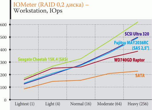 Ну а теперь обратимся непосредственно к оценке производительности. При работе в RAID 0 из двух дисков результаты были вполне прогнозируемыми – 15-тысячник с SAS-интерфейсом уверенно показал самое высокое быстродействие, обойдя SCSI-диски с частотой вращения 10 000 об/мин, а вот диск Fujitsu продемонстрировал такую же производительность, как и 10-тысячник SCSI. При переходе к RAID 5 ситуация несколько изменилась – здесь уже Fujitsu, несмотря на аналогичную со SCSI-участниками частоту вращения, показал ощутимо бόльшую скорость. Что касается Cheetah 15K.4, то он по-прежнему вне конкуренции. Очевидно, дело здесь не только в использовании двух портов у SAS-моделей, но и в лучшей оптимизации firmware последних.