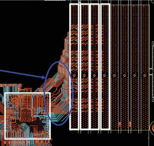 На прилагаемых иллюстрациях показан фрагмент разводки четырех модулей обычных DIMM на одном канале. Причем очевидно, что для модулей FB-DIMM на двух каналах, несмотря на кажущееся усложнение, он значительно проще.