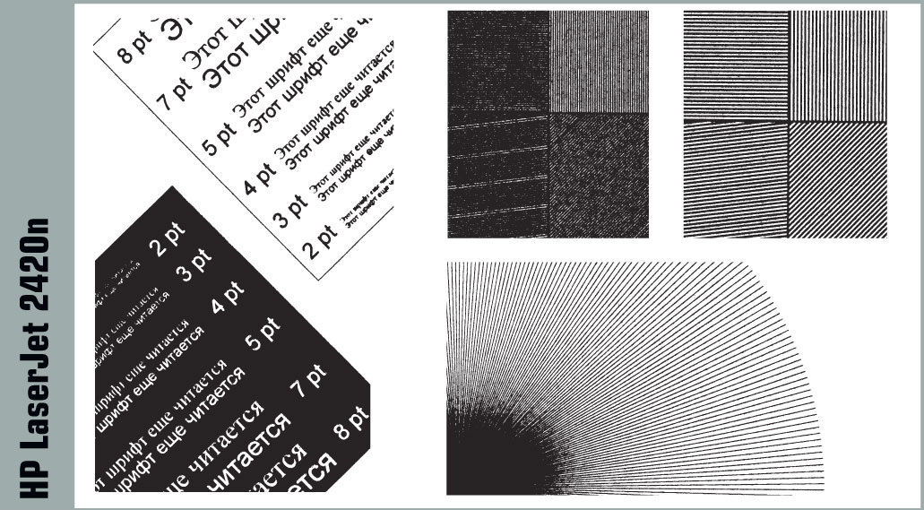 Но об этом немного позже, а сейчас хотелось бы отметить модель HP LaserJet 2420n. Она продемонстрировала не только лучший общий результат в своей группе, но и почти догнала гораздо более мощные аппараты формата А3. Кроме того, отпечатки с элементами векторной и растровой графики, сделанные на этом принтере, не содержали каких-либо заметных огрехов. Да и дизайн модели нам показался весьма интересным. Поэтому