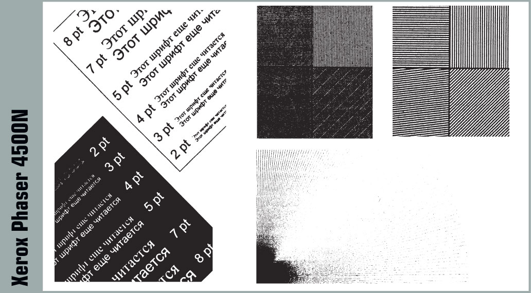 Результаты тестирования продемонстрировали, что при печати текста принтер развивает потоковую производительность 34 с./мин, что немного меньше заявленной 35 с./мин. Но с увеличением объемов растровой графики в заданиях производительность заметно падает, хотя и не такими темпами, как у младшей модели. Тем не менее Phaser 4500N выдает первую страницу быстрее, чем остальные участники обзора, использующие бумагу формата А4.