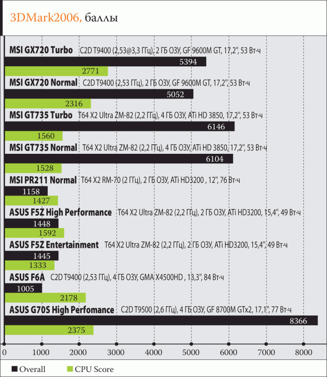 И это при разнице в массе в 1,5 раза и почти троекратном отличии во времени автономной работы, а также несмотря на батарею меньшей емкости! Система на Turion тоже показала себя на достойном уровне в игровых тестах: хотя ее CPU явно слабее, ей сильно помогло наличие мощной видеокарты, «заточенной» под все последние веяния игровой моды. В тестах же более старых вопрос первенства решается не столько платформами, сколько оптимизацией видеокарт: если в 3DMark2001 лидерство остается за MSI GX720, то в 3DMark2006 он уступает не только ушедшему в далекий отрыв SLI-тандему в ASUS G70S, но и MSI GT735, демонстрирующему всю мощь своего видеопроцессора.