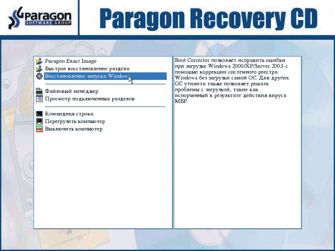 Отдельного упоминания заслуживает Paragon Recovery CD, который входит в состав обоих пакетов, а в случае приобретения через Интернет поставляется в виде образа. С него можно загрузиться либо под PTS DOS, либо под Linux, к тому же имеется свой графический интерфейс. В основу диска положен все тот же Drive Backup, который позволяет полноценно работать с резервными копиями разделов, менять их статус и просматривать содержимое, а также корректировать MBR, boot.ini и загрузочные записи в реестре.