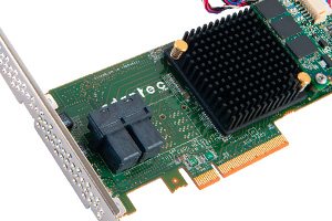 Adaptec 7805Q – это 6Gb SAS/SATA контроллер на шину x8 PCIe 3.0, c памятью 1GB. На нем два внутренних мини-разъема HD mSAS (SFF-8643) и разъем для подключения флэш-модуля AFM-700 (входит в комплект поставки). Соединительный кабель в поставку не входит, его надо подбирать под условия подключения дисков и тип корзины, всего их есть три типа: HDmSAS-mSAS, HDmSAS-4SATA, HDmSAS-4SAS.