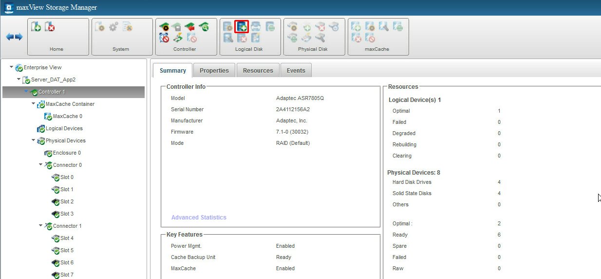 Кнопки центральной панели управления сгруппированы по объектам воздействия (System, Controller, Logical Disk, Physical Disk, maxCache). Для создания основного RAID-массива из HDD надо нажать соответствующую кнопку (ниже выделено красным) в группе Logical Disk.