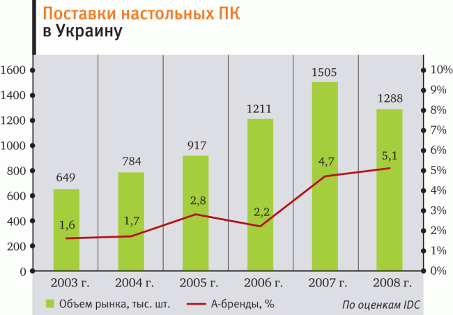 По оценкам аналитиков IDC, в 2008 г. объем поставок в Украину настольных ПК уменьшился на 14,4% по сравнению с позапрошлым годом и равнялся 1,288 млн единиц. Это обусловлено как глобальным падением ИТ-рынка во второй половине минувшего года, так и ростом на 46,3% поставок ноутбуков. Из общего объема отгруженных в канал десктопов 30,7% составляет продукция Топ 10 украинских сборщиков (из них около 65% – доля первой пятерки), 5,1% – компьютеры производства А-брендов. Бoльшая же часть ПК собирается средними и мелкими локальными компаниями, находящимися за пределами десятки лидеров. Список крупнейших поставщиков десктопов на украинский рынок в минувшем году, по оценкам IDC, выглядит следующим образом: «Навигатор», «К-Трейд», «Версия-Системс», «МКС» и Hewlett-Packard. По сравнению с 2007 г. в нем произошли незначительные изменения: «Фокстрот ИТ» покинула четвертое место и переместилась за пределы Топ 5. В целом же рейтинг остался прежним.