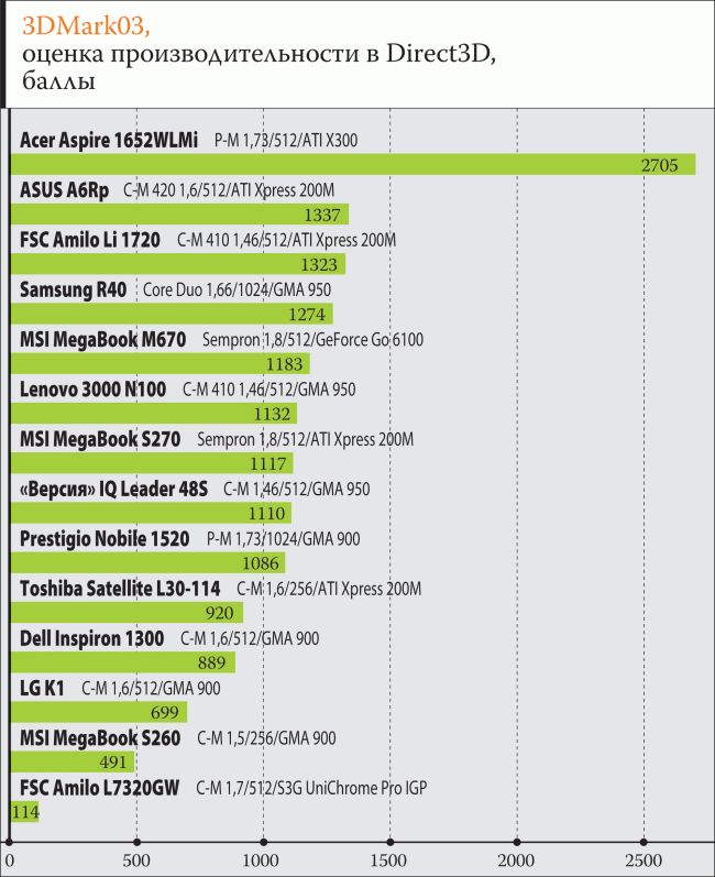 3DMark03. Здесь расстановка сил немного иная. Ноутбуки разделились на четыре группы. Первую единолично занял Acer Aspire 1652WLMi, который не имеет конкурентов благодаря неплохому видеоадаптеру. Во второй, с отставанием ровно в два раза, идут модели с ATI Radeon Xpress 200M и новыми Celeron M/Sempron. Аналогичную производительность показывает и Samsung R40, у которого недостаток быстродействия видеоядра компенсируется мощным процессором. В третью группу вошли ноутбуки со старыми Celeron M в связке с ATI Radeon Xpress 200M и Intel GMA 950. Не отстает от них, благодаря CPU Pentium M, и Prestigio Nobile 1520. Четвертая группа – как правило, ноутбуки с Celeron M и Intel GMA 900, что и обусловливает столь малый уровень их производительности. Что касается показателей Toshiba Satellite L30-114 и FSC Amilo L7320GW, то в первом случае причиной низкого результата стал слишком малый объем ОЗУ, а результат Amilo L7320GW и вовсе можно считать формальным – он выполнил всего один тест и на большее у S3G UniChrome Pro IGP сил просто не хватило. По поводу отсутствующих на диаграмме Toshiba Satellite L100-113, Acer Aspire 3634WLMi и Terra Smartbook i110Z можем повторить только вышесказанное – устаревшие графические ядра не позволяют этим ноутбукам вообще получить результат в 3DMark03.