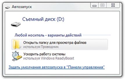 | После подключения флэш-накопителя в окне выбора вариантов действий появляется пункт "Ускорить работу системы", вызывающий ReadyBoost |