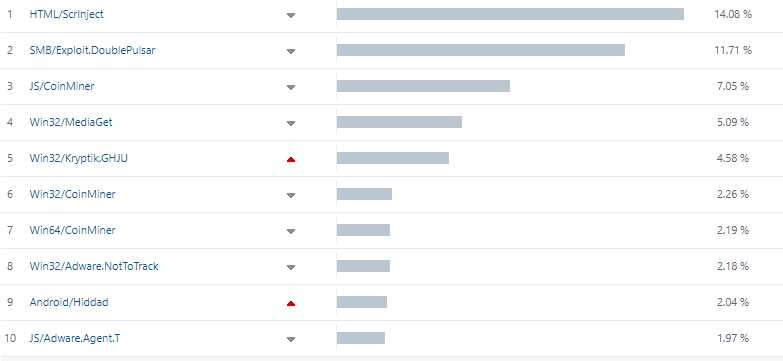 Вторую позицию заняла угроза SMB/Exploit.DoublePulsar, которая предотвращала использование уязвимых систем вредоносным программным обеспечением Win32/Exploit.CVE-2017-0147.A и Win32/Filecoder.WannaCryptor.