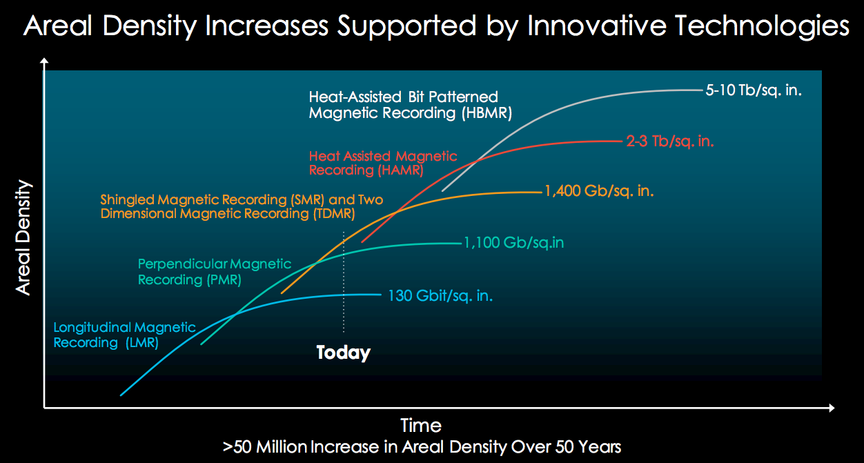 Но и это не предел возможностей HDD. На горизонте уже появилась технология магнитной записи с тепловой поддержкой и распределением битов (Heat-Assisted Bit Patterned Magnetic Recording, HBMR), которая даст возможность еще в 2-3 раза поднять потолок плотности.