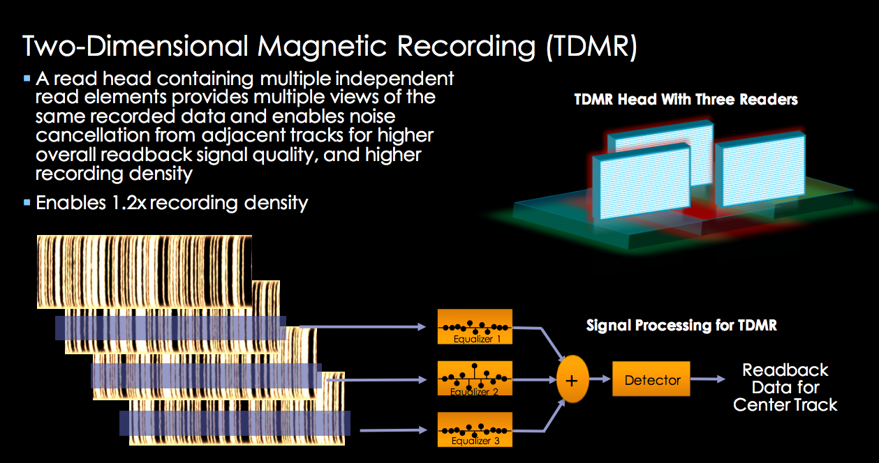 Напомним, что впервые SMR была представлена в 2015 году. А следующим шагом в развитии технологий жестких дисков станет двунаправленная магнитная запись (Two-Dimensional Magnetic Recording, TDMR). Она предусматривает усложнение конструкции головки, где появится три считывающие канала, охватывающие три соседних дорожки с записанными данными. Поступающие с них сигналы будут обрабатываться для выделения данных с центральной. Такая конструкция позволит увеличить соотношение сигнал/шум. В результате плотность записи увеличится еще в 1,2 раза.